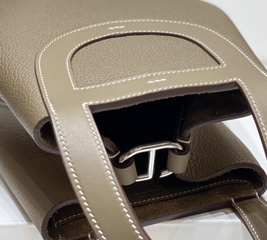 The Hermès The Loop’s distinctive elegance is born from its chosen materials. The bag features handles crafted from Double Swift leather, a supple, fine-grained calfskin renowned for its soft, smooth texture and exceptional ability to absorb color, resulting in the rich, nuanced depth of this Elephant Grey hue. The iconic Chaine d’Ancre (Anchor Chain) is more than a closure; it is a historic Hermès motif dating back to the 1930s, symbolizing strength and timeless connection. Our replica ensures the chain has the correct, substantial weight and flawless, hypoallergenic metal plating, turning a functional element into a piece of wearable history.