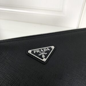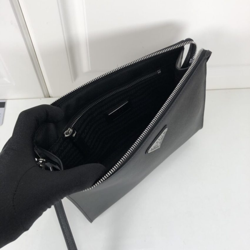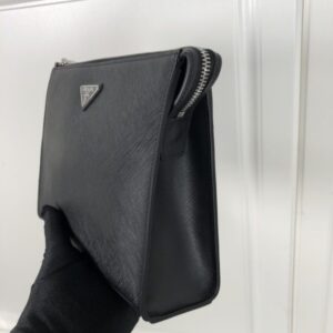 We include the optional, detachable chain strap, allowing you to transform the pouch from an elegant handheld clutch into a chic crossbody bag in seconds. This adaptability speaks to Prada’s design philosophy: intelligent, functional, and eternally stylish. It’s a piece that conveys understated sophistication, speaking to those who understand that true luxury is often whispered, not shouted.